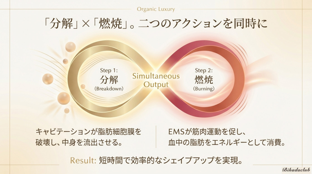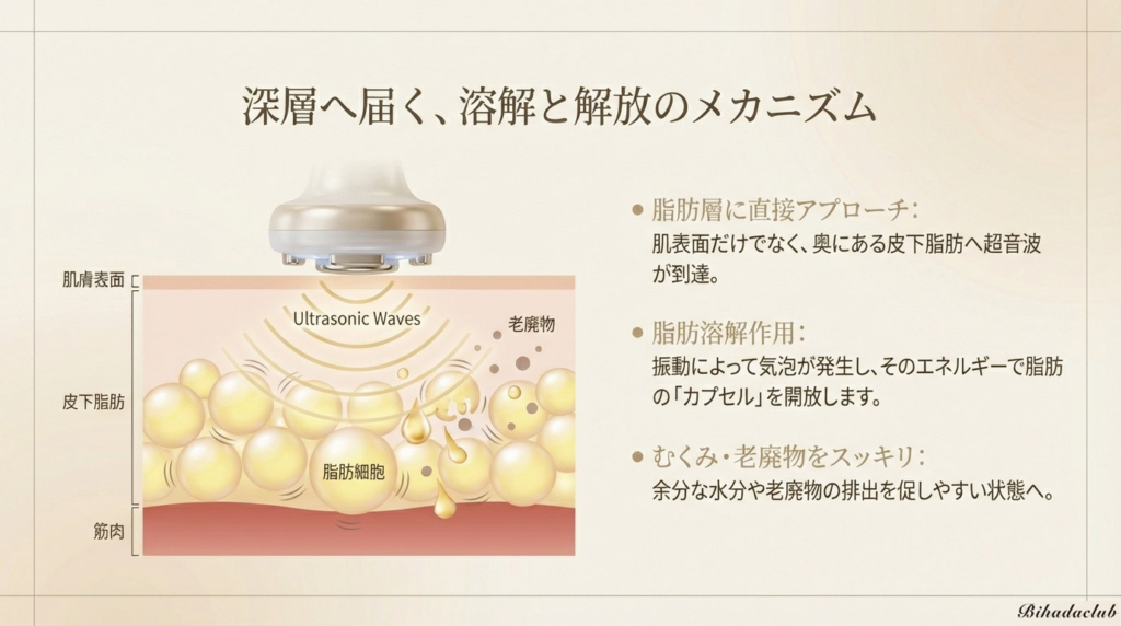 超音波の振動により、脂肪細胞の膜に作用。 凝り固まったセルライトを細かく柔らかく分解し、 脂肪を血液中に流出させます。 まるで氷が水に溶けるように、身体の巡りを整える準備を整えます。