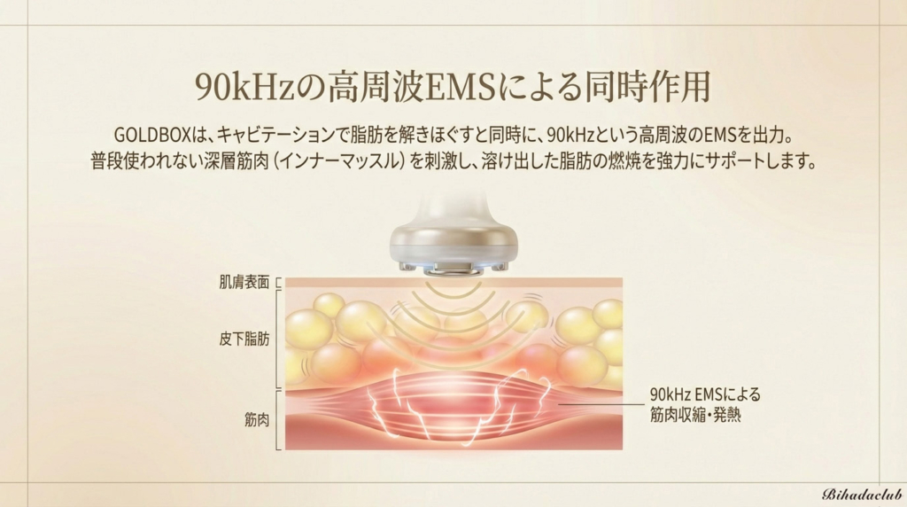 ゴールドボックスのキャビテーションは90kHzという周波数高めのEMSが奥まで同時作用!痩身を強力にサポートしてくれます。
